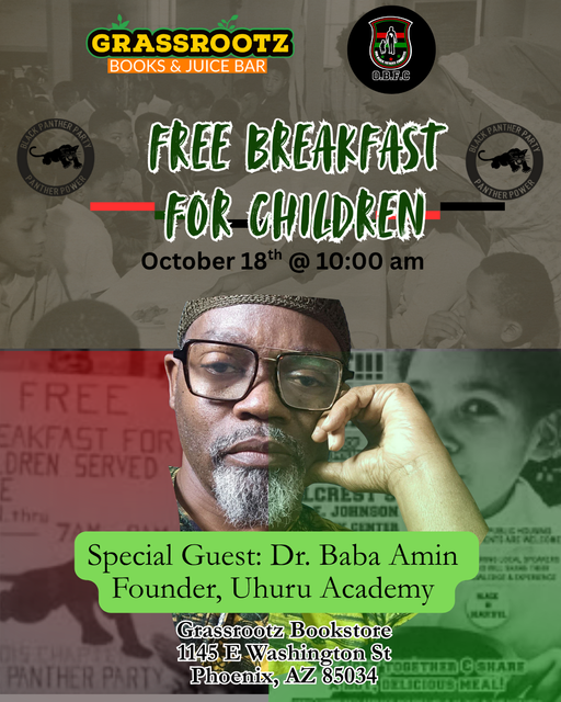 In October we recognize and celebrate the The Black Panther Party for Self Defense which was founded on October 15, 1966. In honor of the Panthers and their work, we’ll be hosting free breakfast program on Saturday 10/18 at Grassrootz Books and Juice Bar with a special guest Dr. Baba Amin. Please register to attend