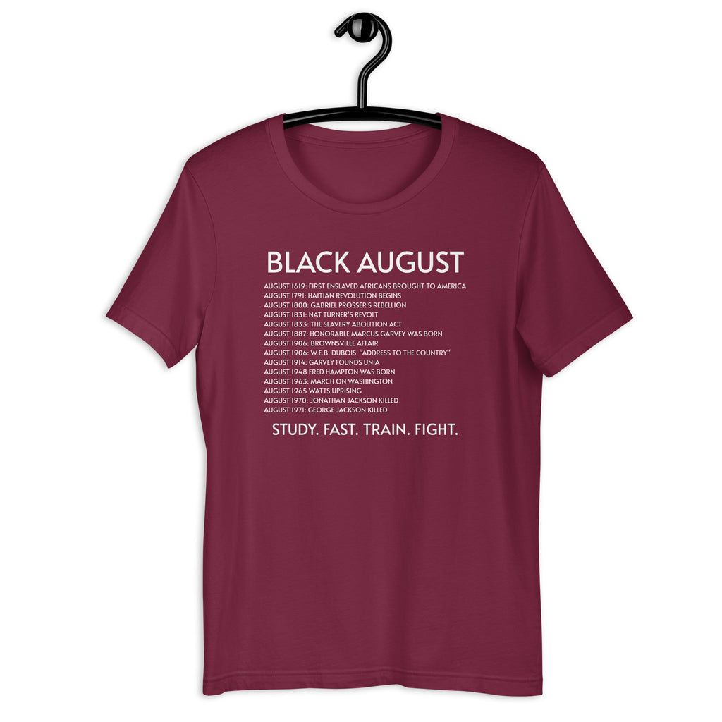 "Black August” is honored every year to commemorate the fallen freedom fighters of the Black Liberation Movement, to call for the release of political prisoners in the United States, to condemn the oppressive conditions of U.S. prisons, and to emphasize the continued importance of the Black Liberation struggle. Observers of Black August commit to higher levels of discipline throughout the month. This can include fasting from food and drink, frequent physical exercise and political study, and engagement in political struggle. In short, the principles of Black August are: “study, fast, train, fight.”